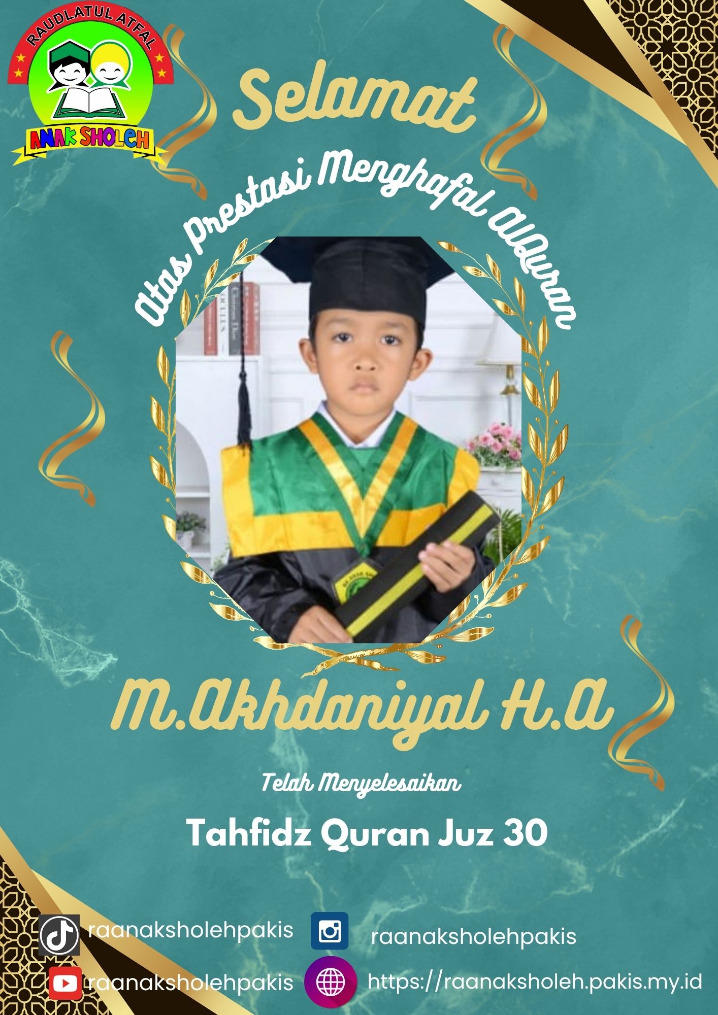 Selamat kepada ananda Muhammad Akhdaniyal H.A siswa kelas B RA Anak Sholeh, yang telah menyelesaikan hafalan Al-Qur’an Juz 30 dengan lancar dan tartil di usia dini. Prestasi ini tidak hanya menunjukkan kecerdasan luar biasa, tetapi juga komitmen dan kedisiplinan Niyal dalam menjalani program tahfidz yang menjadi unggulan di RA Anak Sholeh.