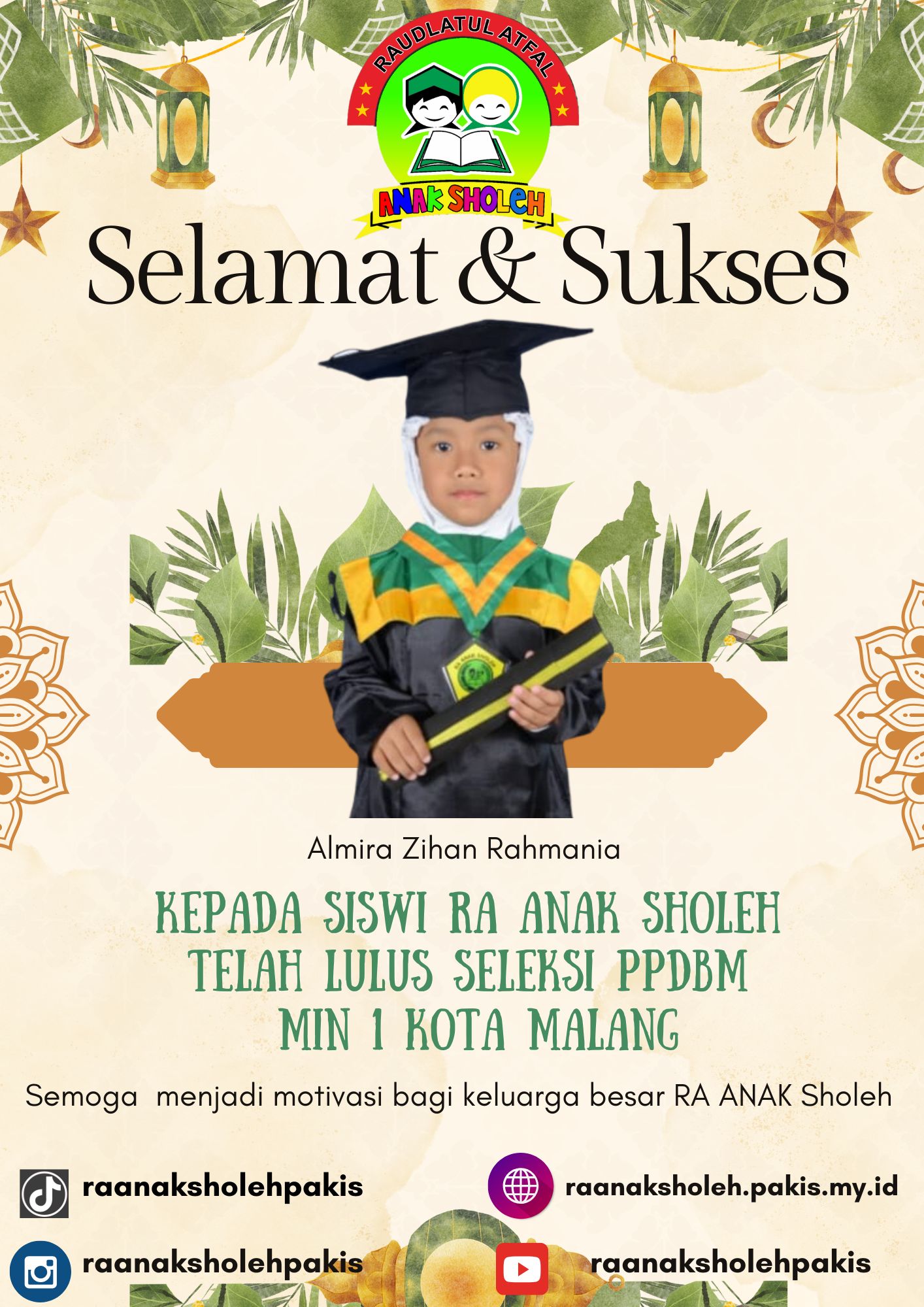 Almira telah melewati proses seleksi yang cukup ketat dengan semangat belajar dan persiapan yang matang. Ini adalah bukti bahwa pendidikan yang diberikan di RA Anak Sholeh mampu mengantarkan peserta didik tidak hanya cakap dalam aspek religius, tetapi juga siap bersaing secara akademik di jenjang pendidikan dasar favorit.